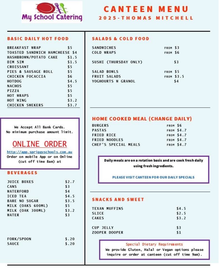 The canteen is open for online lunch orders everyday using the Spriggy Schools App. New families to the school will need to download this App and register each child prior to placing their first lunch order using the Spriggy Schools App Instructions. Online orders for the same day must be placed prior to 9.00am, unfortunately any orders received after that time will not be fulfilled.